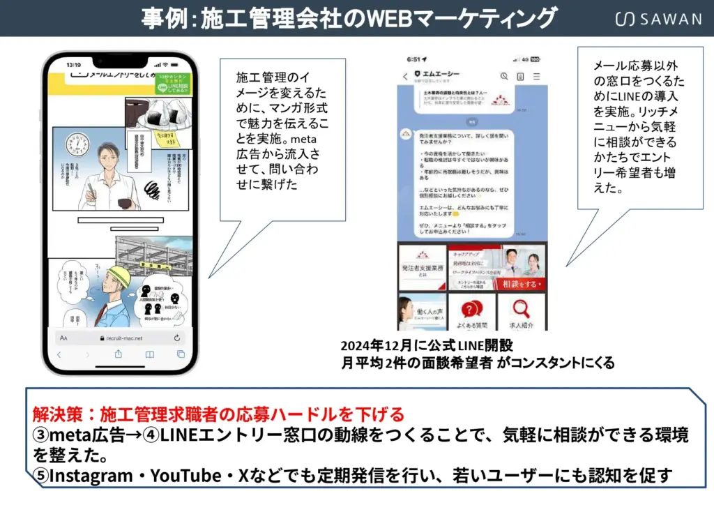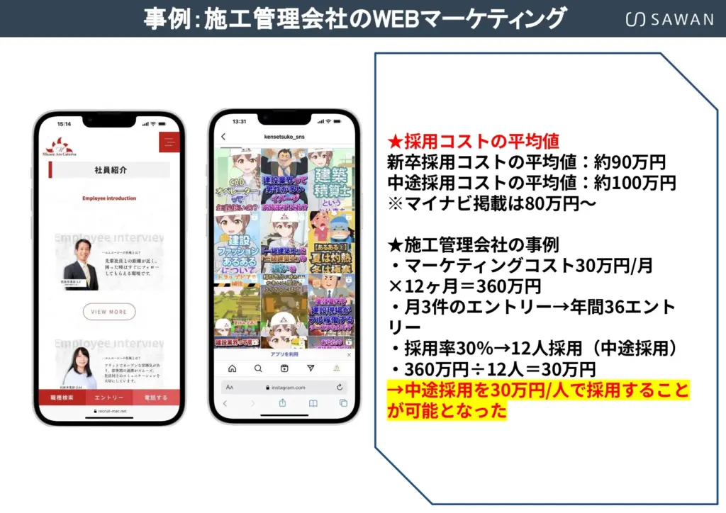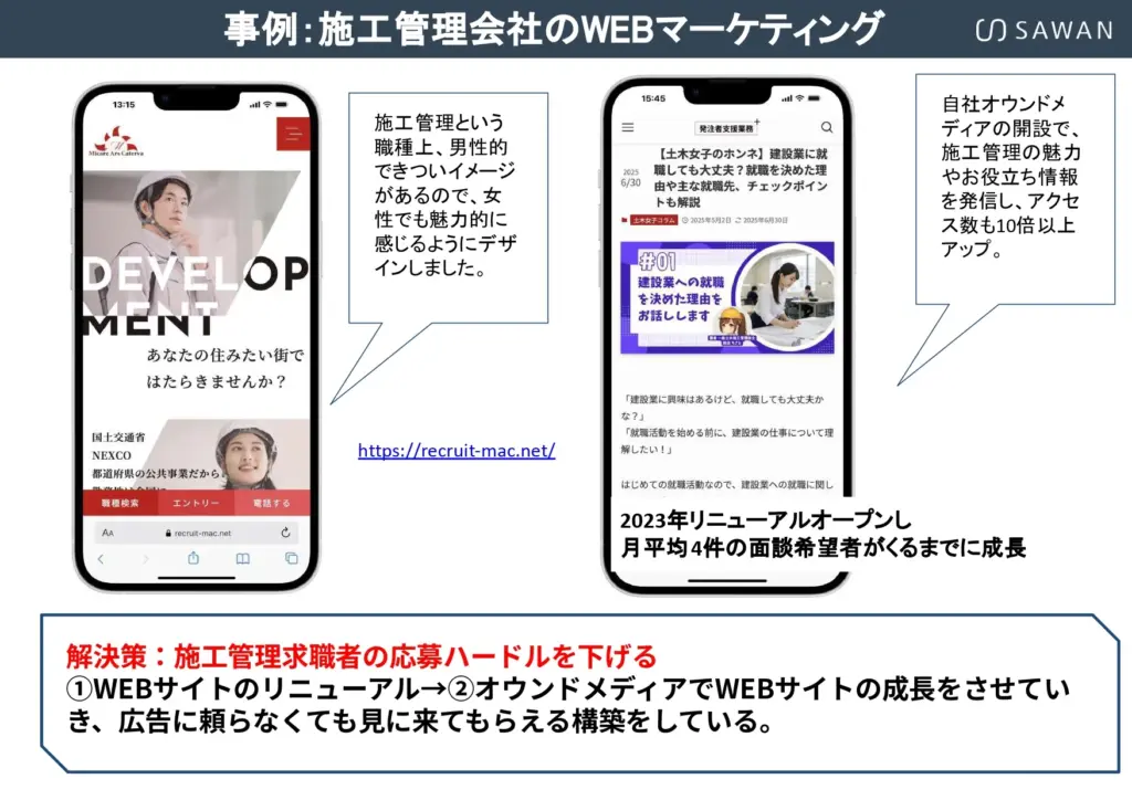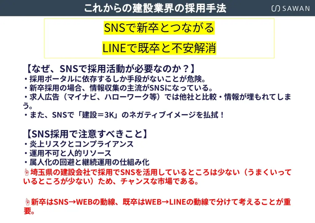 施工エリア内の競合企業を見渡すと、多くがポータルサイトに依存し、採用ページは似たような内容ばかりです。その中で「自社サイト×オウンドメディア×SNS」を活用すれば、確実に差別化できます。他社がやっていないことを先に始めることが、中小建設会社にとって最も有効な戦略となるでしょう。